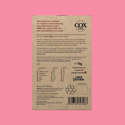 Coming SoonCox & Co Chocolate Flat Egg Bar [Raw Cacao Nibs]