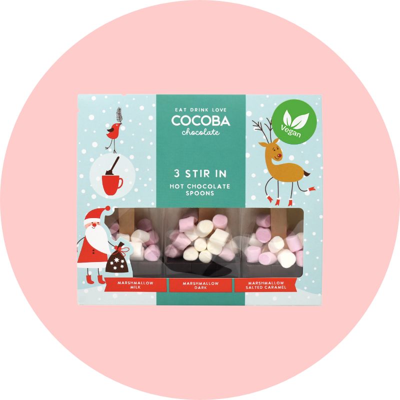The perfect vegan-friendly stocking filler for Christmas, containing three delicious hot chocolate spoon flavours topped with vegan mini marshmallows.