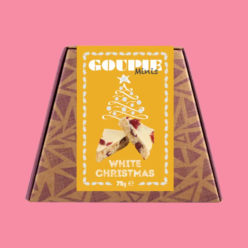 Goupie's very own Christmas creation: White Christmas Goupie! Filled with cardamom, dried cranberries and citrus peel before being topped with their caramel-infused white chocolate and topped with cranberries. This is the ultimate Christmas treat, and goes perfectly with those festive bubbles!