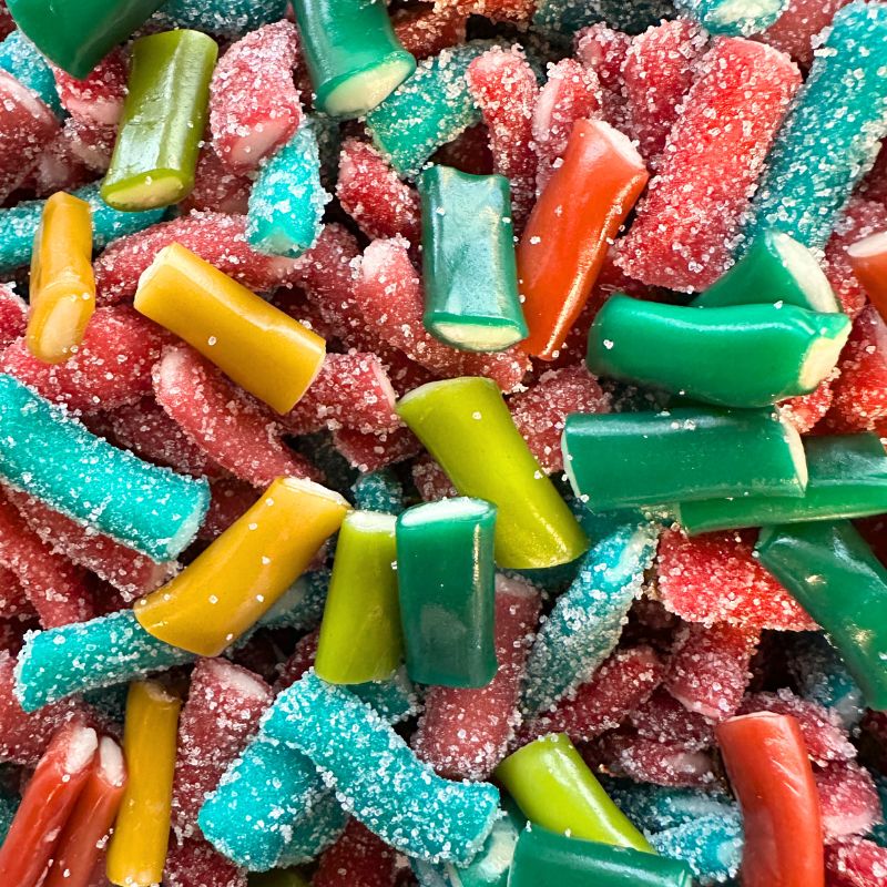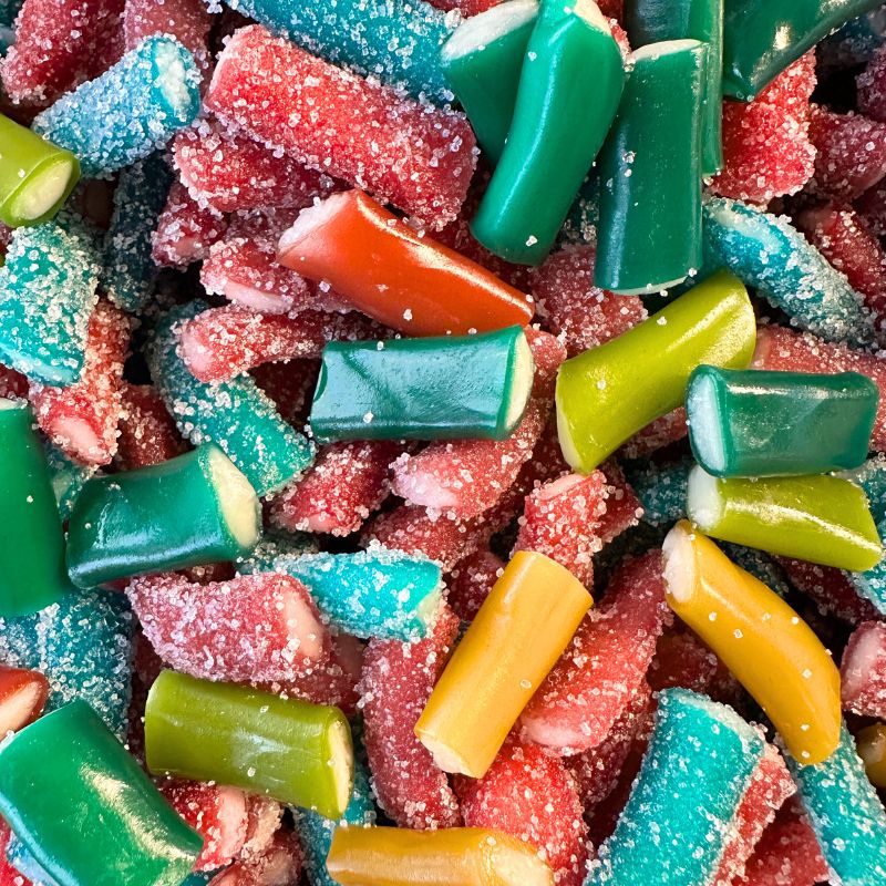Sugar, Glucose Syrup, Wheat Flour, Water, Coconut Oil, Stabilizer (Modified Starch), Dextrose, Thickener (E414 Gum Arabic), Humectant (E420 Sorbitol), Glazing Agent (Vegetable Oil), Acidity Regulator (E330 Citric Acid, E298 Malic Acid), Aroma, Colourants (E100, E133, E163), Emulsifier (E471)