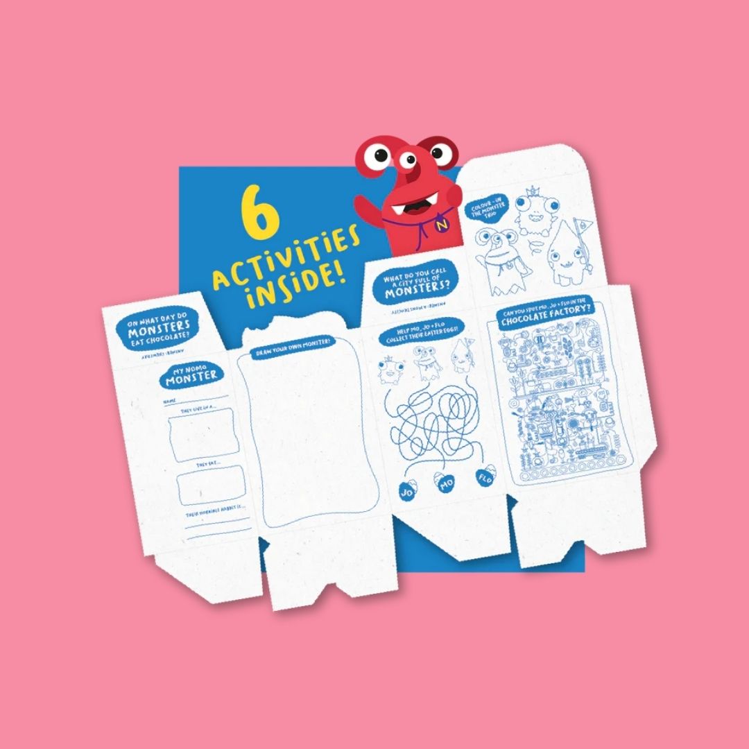 Introducing Nomo's kids easter egg and lolly! Meet Mo, Jo and Flo - a motley monster trio on a mission to ensure little taste buds don't miss out on delicious easter chocolate.